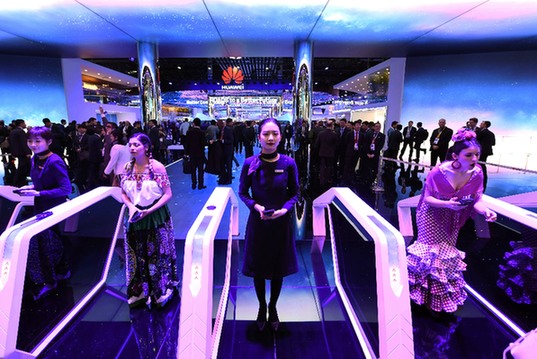 為期四天的2018年世界移動(dòng)通信大會(huì)2月26日在巴塞羅那開幕。圖為當(dāng)日,人們?cè)谖靼嘌腊腿_那舉行的世界移動(dòng)通信大會(huì)上參觀華為公司展臺(tái)。新華社記者 郭求達(dá) 攝