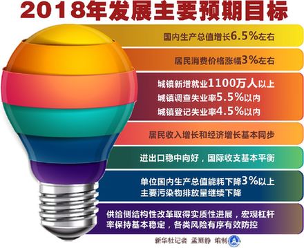 政府工作報告提出,今年發(fā)展主要預期目標是:國內(nèi)生產(chǎn)總值增長6.5%左右;居民消費價格漲幅3%左右;城鎮(zhèn)新增就業(yè)1100萬人以上,城鎮(zhèn)調(diào)查失業(yè)率5.5%以內(nèi),城鎮(zhèn)登記失業(yè)率4.5%以內(nèi);居民收入增長和經(jīng)濟增長基本同步;進出口穩(wěn)中向好,國際收支基本平衡;單位國內(nèi)生產(chǎn)總值能耗下降3%以上,主要污染物排放量繼續(xù)下降;供給側(cè)結(jié)構(gòu)性改革取得實質(zhì)性進展,宏觀杠桿率保持基本穩(wěn)定,各類風險有序有效防控。