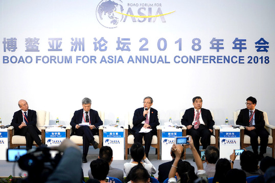 4月8日,博鰲亞洲論壇2018年會(huì)新聞發(fā)布會(huì)暨旗艦報(bào)告發(fā)布會(huì)在海南博鰲舉行。這是博鰲亞洲論壇秘書(shū)長(zhǎng)周文重(中)在發(fā)言。新華社記者 邢廣利 攝