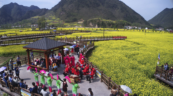 漢中市勉縣老年大學(xué)的學(xué)員們在唐家灣油菜花觀光點(diǎn)為旅游者表演節(jié)目。