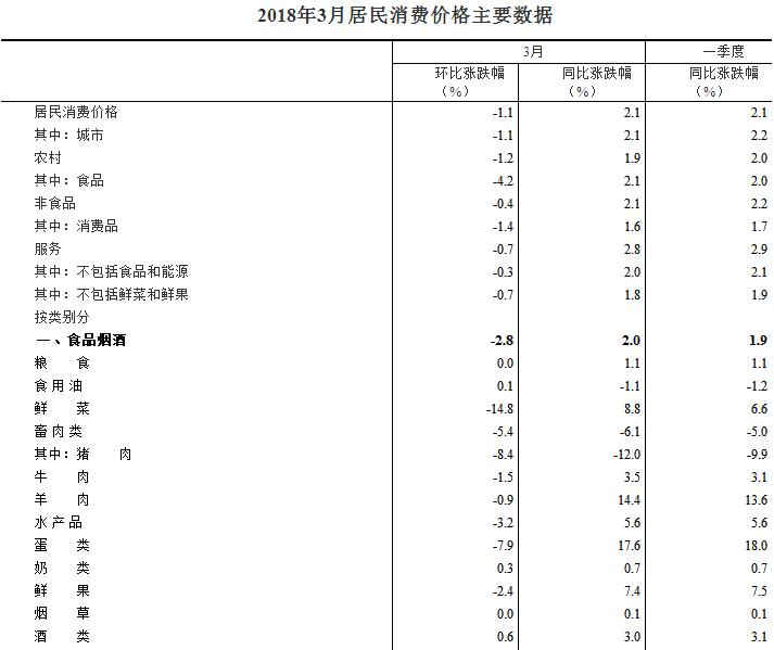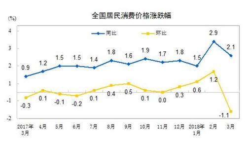 4月11日,國(guó)家統(tǒng)計(jì)局發(fā)布統(tǒng)計(jì)數(shù)據(jù),2018年3月份,全國(guó)居民消費(fèi)價(jià)格同比上漲2.1%。其中,城市上漲2.1%,農(nóng)村上漲1.9%;食品價(jià)格上漲2.1%,非食品價(jià)格上漲2.1%;消費(fèi)品價(jià)格上漲1.6%,服務(wù)價(jià)格上漲2.8%。一季度,全國(guó)居民消費(fèi)價(jià)格總水平比去年同期上漲2.1%。