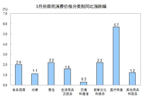 2018年3月份,全國(guó)居民消費(fèi)價(jià)格同比上漲2.1%。其中,城市上漲2.1%,農(nóng)村上漲1.9%;食品價(jià)格上漲2.1%,非食品價(jià)格上漲2.1%;消費(fèi)品價(jià)格上漲1.6%,服務(wù)價(jià)格上漲2.8%。一季度,全國(guó)居民消費(fèi)價(jià)格總水平比去年同期上漲2.1%。