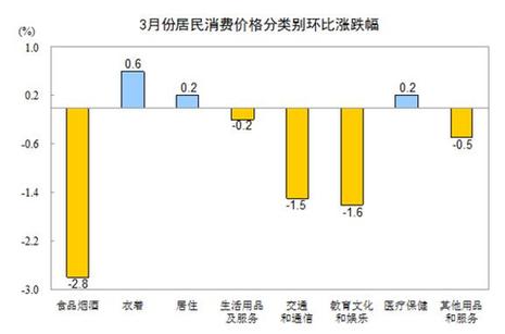 3月份,全國(guó)居民消費(fèi)價(jià)格環(huán)比下降1.1%。其中,城市下降1.1%,農(nóng)村下降1.2%;食品價(jià)格下降4.2%,非食品價(jià)格下降0.4%;消費(fèi)品價(jià)格下降1.4%,服務(wù)價(jià)格下降0.7%。