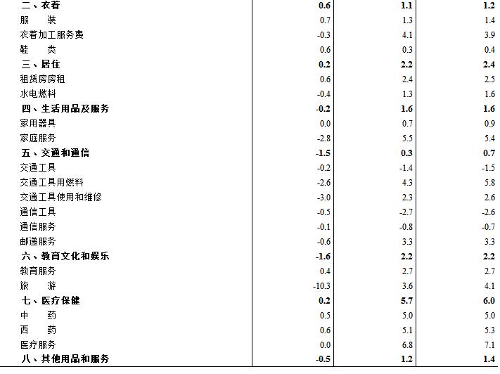 其他七大類價(jià)格環(huán)比三漲四降。其中,衣著、居住、醫(yī)療保健價(jià)格分別上漲0.6%、0.2%和0.2%;教育文化和娛樂(lè)、交通和通信價(jià)格分別下降1.6%和1.5%,其他用品和服務(wù)、生活用品及服務(wù)價(jià)格分別下降0.5%和0.2%。