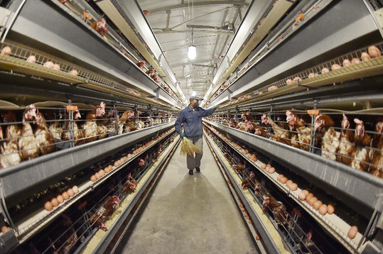 經(jīng)過(guò)數(shù)道“關(guān)卡”消毒,記者才進(jìn)入蛋雞養(yǎng)殖區(qū)域,看到所有雞舍均經(jīng)過(guò)密閉化處理,與外界人員嚴(yán)格隔離,雞舍內(nèi)采用德國(guó)進(jìn)口智能化飼養(yǎng)設(shè)備,并有自動(dòng)調(diào)控溫度、濕度、空氣的內(nèi)控系統(tǒng)。3條自動(dòng)傳送帶將雞蛋、雞糞、飼料分離傳送,自動(dòng)化蛋品揀選設(shè)備對(duì)每一枚雞蛋進(jìn)行檢測(cè)、殺菌、噴碼和分級(jí)處理,雞糞則通過(guò)地下輸糞帶送入發(fā)酵處理系統(tǒng)。