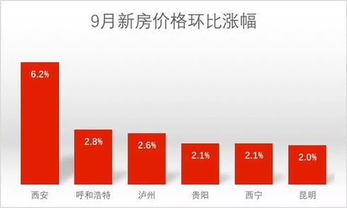 其中,新房環(huán)比上漲最明顯的是西安,漲幅高達(dá)6.2%,其余幾個(gè)城市漲幅也超過(guò)2%。