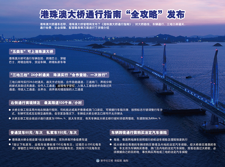 新華社廣州10月21日電(記者 周強)港珠澳大橋通車在即,港珠澳大橋管理局發(fā)布了《港珠澳大橋通行指南》,對大橋路線、車輛通行、三地口岸通關、通行收費、安全保障、配套服務等方面進行了詳細介紹。