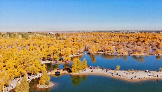 游客在甘肅金塔沙漠胡楊林景區(qū)賞秋。記者 張?!z