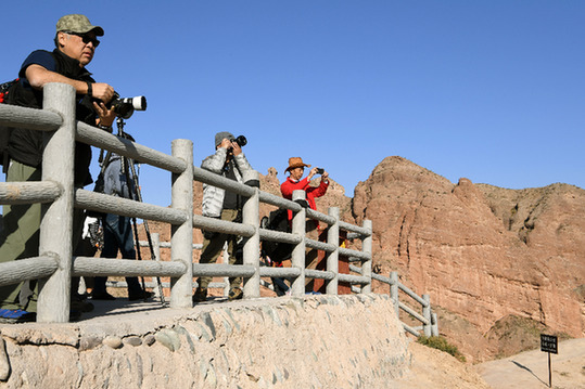 攝影愛好者在甘肅張掖的冰溝丹霞景區(qū)拍攝秋景。記者 范培珅 攝