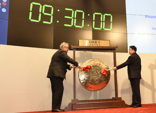 兗礦集團(tuán)董事長(zhǎng)李希勇、兗煤澳洲獨(dú)立非執(zhí)行董事芮捷銳為兗煤澳洲在港交所上市敲鑼。(資料照片)