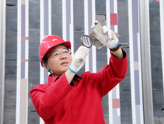 大港油田總經(jīng)理趙賢正現(xiàn)場(chǎng)查看巖心樣本。資料照片
