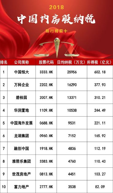 恒大以602.18億元所得稅登2018年中國(guó)內(nèi)房股納稅榜單排名第一