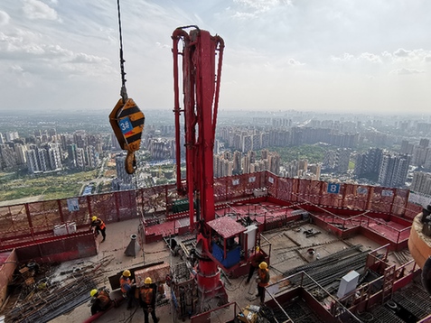 “效率比傳統(tǒng)塔吊大約提升30%?!敝袊ㄖ谌こ叹钟邢薰荆ㄏ路Q“中建三局”)綠地中心468項(xiàng)目總工程師楊書海說:“這一系統(tǒng)由中建三局獨(dú)立設(shè)計(jì)研發(fā),具有自主知識(shí)產(chǎn)權(quán)。其中有施工集成平臺(tái),有無人操作的智能電梯,還有中建三局首創(chuàng)的廻轉(zhuǎn)塔機(jī),最多可以安裝4臺(tái)塔吊,根據(jù)吊裝需求選擇各式塔機(jī)合理配置,實(shí)現(xiàn)多塔機(jī)整體、連續(xù)、快速、安全頂升,平均每6天建一層樓,獲得多項(xiàng)國家專利。”