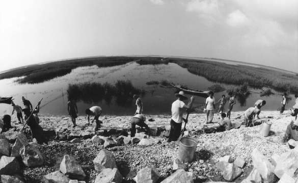 白洋淀砌石護(hù)堤防汛(攝于1994年)