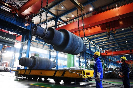 在中國一重集團的生產(chǎn)車間,起重機吊起產(chǎn)品。記者 王建威 攝