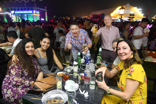 外國游客在青島西海岸新區(qū)金沙灘啤酒城一啤酒吧體驗、消費。記者 李紫恒 攝