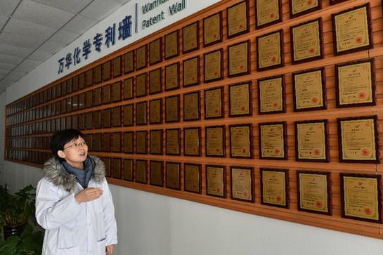 在煙臺萬華化學集團中央研究院先進表面材料中心,萬華員工在專利墻前介紹萬華取得的科技創(chuàng)新成就。資料照片