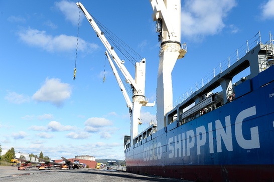 圖為中遠海運“天恩”輪在瑞典東北部港口城市海訥桑德的碼頭上進行卸貨作業(yè)。記者 劉紅霞 攝
