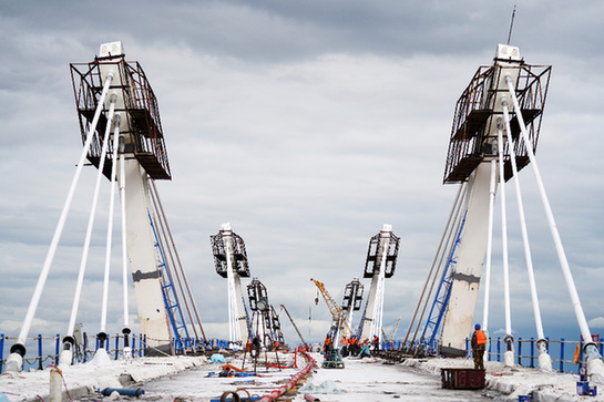 中俄合建的首座跨境公路大橋——黑河到布拉戈維申斯克黑龍江(阿穆爾河)大橋進入橋面鋪裝施工作業(yè)階段。(記者 王建威 攝)