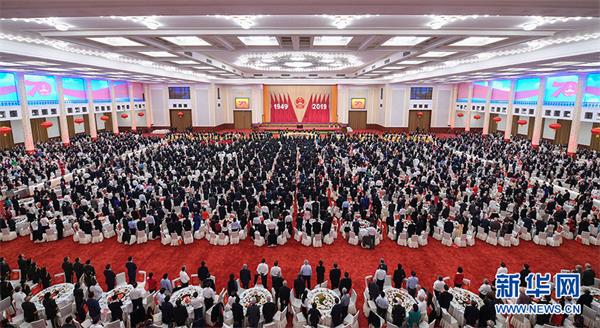 9月30日晚,慶祝中華人民共和國成立70周年招待會在北京人民大會堂隆重舉行。習(xí)近平、李克強、栗戰(zhàn)書、汪洋、王滬寧、趙樂際、韓正、王岐山等黨和國家領(lǐng)導(dǎo)人與4000余名中外人士歡聚一堂,共慶新中國70華誕。 新華社記者 黃敬文 攝