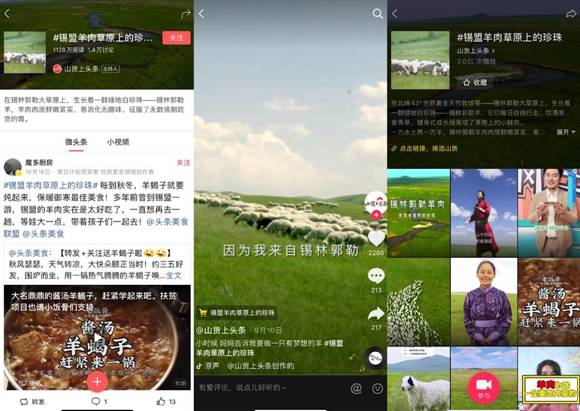 “山貨上頭條”是基于今日頭條等產(chǎn)品發(fā)起的扶貧項(xiàng)目,為了讓內(nèi)蒙古特色更好地走出去,項(xiàng)目組為當(dāng)?shù)卮_定了“錫林郭勒羊,來(lái)自大草原的珍珠”的品牌傳播定位,邀請(qǐng)專業(yè)內(nèi)容制作團(tuán)隊(duì)、平臺(tái)優(yōu)質(zhì)內(nèi)容創(chuàng)作者以圖文、短視頻等方式,展示羊肉產(chǎn)品特點(diǎn)、草原生態(tài)環(huán)境等,并帶動(dòng)平臺(tái)用戶共同傳播推廣,從而提升錫林郭勒羊肉產(chǎn)品品牌認(rèn)知度。
