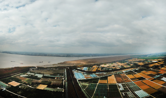 長江從崇明島(前)和江蘇省海門市之間流向大海。記者 方喆 攝