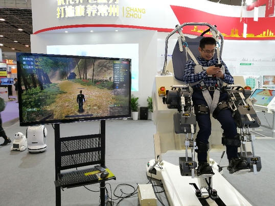 江蘇常州一家公司的康復(fù)訓(xùn)練產(chǎn)品,亮相2019江蘇國際養(yǎng)老服務(wù)業(yè)博覽會(huì)。(新華社發(fā))