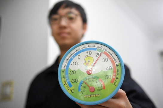 12月4日,長春市熱力集團(tuán)工人在用溫度計(jì)展示一戶居民家的室溫。