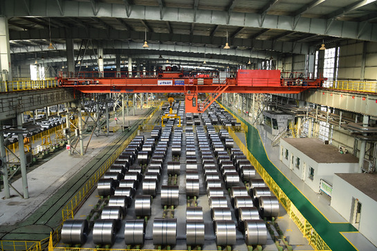 無人吊車在包鋼集團(tuán)稀土鋼板材廠冷軋軋后庫夾取鋼卷。新華社發(fā)(李志鵬 攝)
