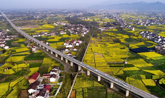 2019年6月,中國(guó)鐵路總公司改制成立的中國(guó)國(guó)家鐵路集團(tuán)有限公司在北京掛牌,為推動(dòng)鐵路高質(zhì)量發(fā)展提供了重要保障。中國(guó)鐵路涌動(dòng)著改革創(chuàng)新的澎湃熱情,圖為一列動(dòng)車(chē)正通過(guò)漢中市南鄭縣新集鎮(zhèn)油菜花海(無(wú)人機(jī)拍攝)。記者 陶明 攝