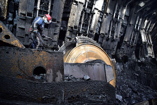 神東煤炭集團(tuán)上灣煤礦12402綜采面內(nèi),工作人員對(duì)采煤機(jī)進(jìn)行檢修。該煤礦新近投用了一批總重量超過(guò)萬(wàn)噸的“鋼鐵巨獸”,用來(lái)“一口吞掉”以前需要多次分層開(kāi)采的特厚煤層,使其在采煤工效、成本、生產(chǎn)能力、生產(chǎn)安全等方面躋身世界一流水準(zhǔn)。神東煤炭集團(tuán)是中國(guó)神華旗下核心煤炭生產(chǎn)企業(yè),由神東礦區(qū)四公司整合而來(lái)。記者 邵瑞 攝