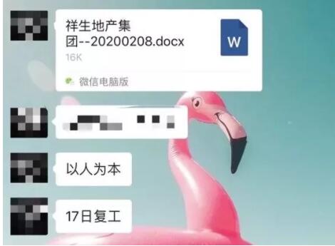 2月9日,臨近復(fù)工,位于新虹的祥生地產(chǎn)集團在群里發(fā)了一則通知:正式復(fù)工時間為2月17日,延長的這7天內(nèi),員工都自行在家隔離,居家云辦公期間,大家通過企業(yè)微信打卡自覺保證工作時間,確保相關(guān)工作正常跟進完成。