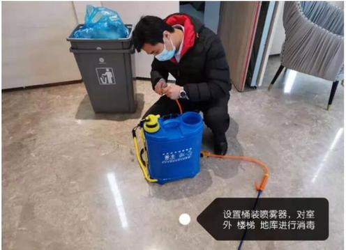 每天傍晚時分,保潔人員對整棟大樓,包括行政區(qū)域、公共區(qū)域、食堂進行消毒,并在群里匯報。