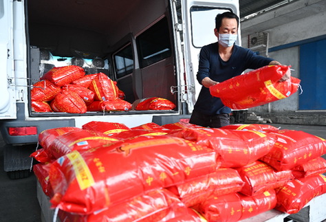 2月8日,福州糧食批發(fā)交易市場(chǎng)一家商鋪的工作人員在搬運(yùn)大米。連日來,福建省內(nèi)糧食企業(yè)采取多種措施,穩(wěn)定市場(chǎng)供應(yīng),保障居民日常消費(fèi)需求。目前,全省糧食市場(chǎng)貨源充足,價(jià)格平穩(wěn)。記者 林善傳 攝