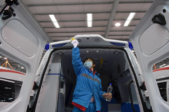 圖為工人在江鈴汽車集團(tuán)改裝車股份有限公司負(fù)壓救護(hù)車生產(chǎn)基地爭分奪秒工作。近來,江西一批批企業(yè)排除萬難恢復(fù)生產(chǎn),開足馬力釋放產(chǎn)能,工人輪班作業(yè)日夜奮戰(zhàn),醫(yī)療物資被源源不斷運(yùn)往抗疫一線。記者 彭昭之 攝