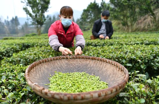 由于冬暖明顯,2月5日起,浙南溫州、麗水等地“烏牛早”春茶已陸續(xù)開(kāi)采,較常年提早大約1周時(shí)間。在麗水市縉云縣胡源鄉(xiāng),8000多畝的茶樹(shù)已萌發(fā)新芽。一大早,茶農(nóng)們就戴上口罩,在茶園里忙碌了起來(lái)?!澳懿烧嗌偈嵌嗌?,把茶青加工成干茶葉放起來(lái),等疫情過(guò)去可以拿到市場(chǎng)上賣。”茶農(nóng)胡愛(ài)仙說(shuō)。