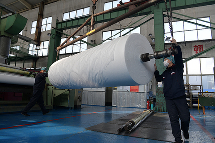 走進(jìn)位于山東省東營(yíng)市的山東俊富無(wú)紡布有限公司(以下簡(jiǎn)稱山東俊富)廠區(qū),記者看到一派繁忙景象。據(jù)悉,從1月27日接到工信部通知后他們就一直加班,全部10條生產(chǎn)線24小時(shí)滿負(fù)荷生產(chǎn)。山東俊富生產(chǎn)的熔噴布日產(chǎn)量約13噸,占全國(guó)1/10,根據(jù)國(guó)家和有關(guān)部門調(diào)度,主要供給湖北和山東的下游企業(yè)。