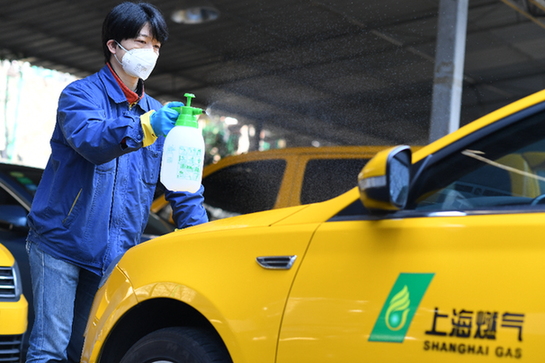 上海燃?xì)鈾z修人員對待命中的出勤車輛進(jìn)行消毒。(企業(yè)供圖)