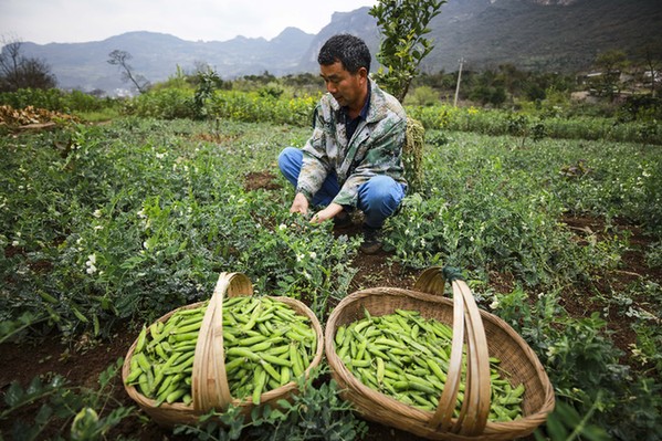 畢節(jié)市黔西縣大關鎮(zhèn)村民在扶貧基地內采摘豌豆。新華社發(fā)(周訓超 攝)