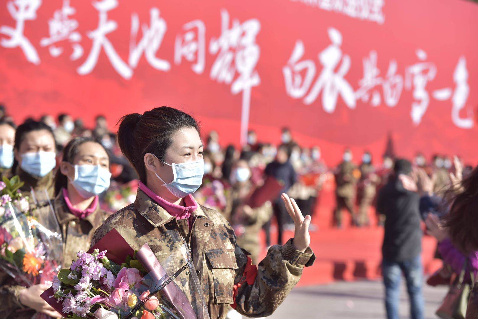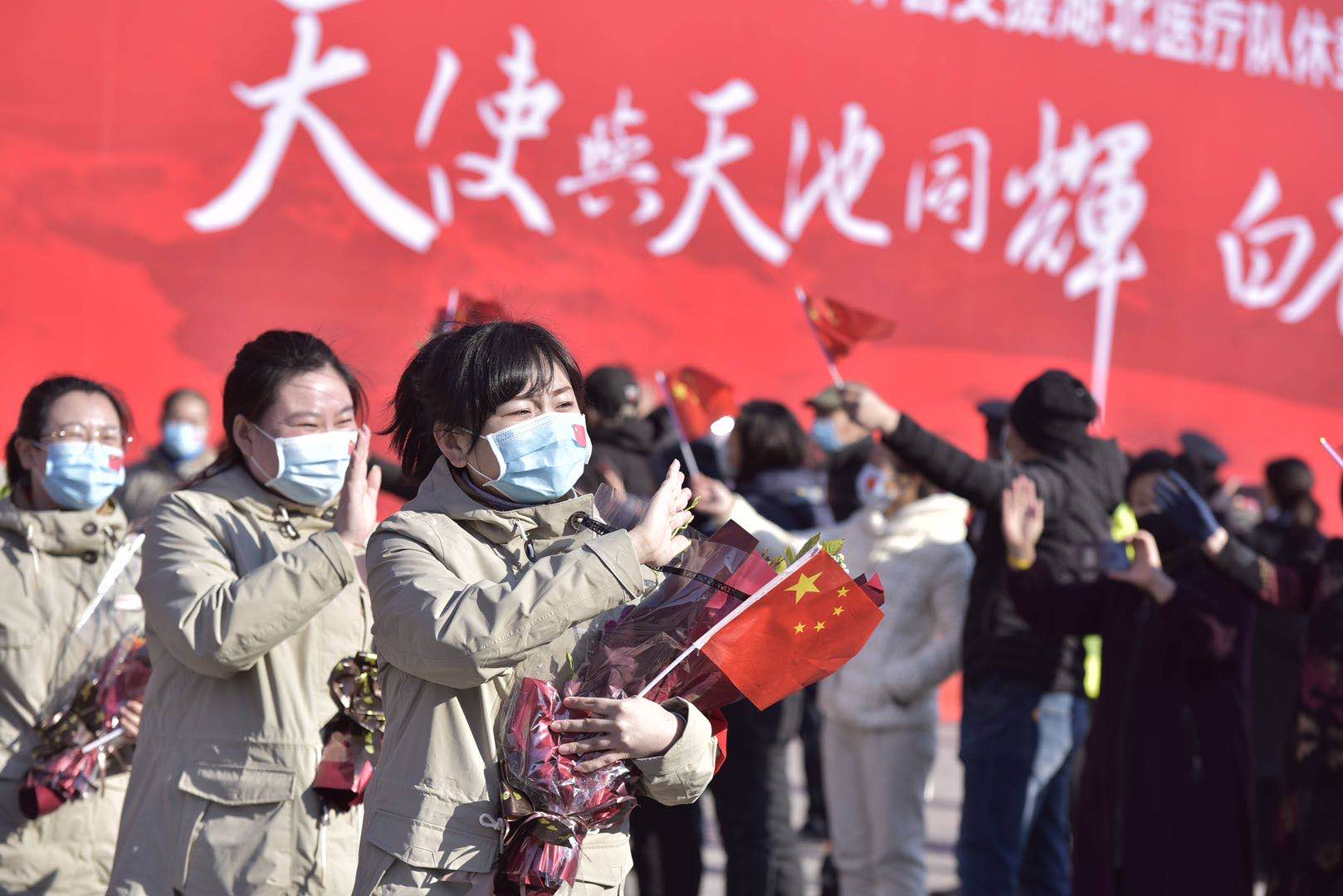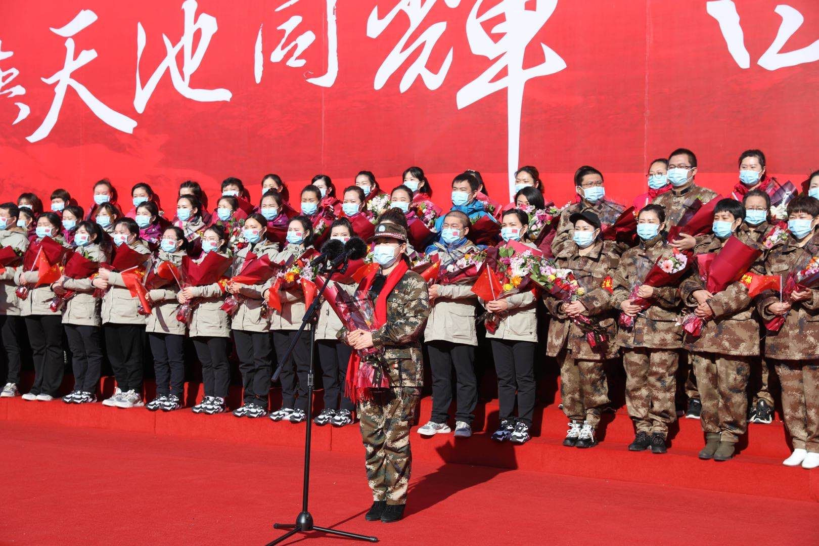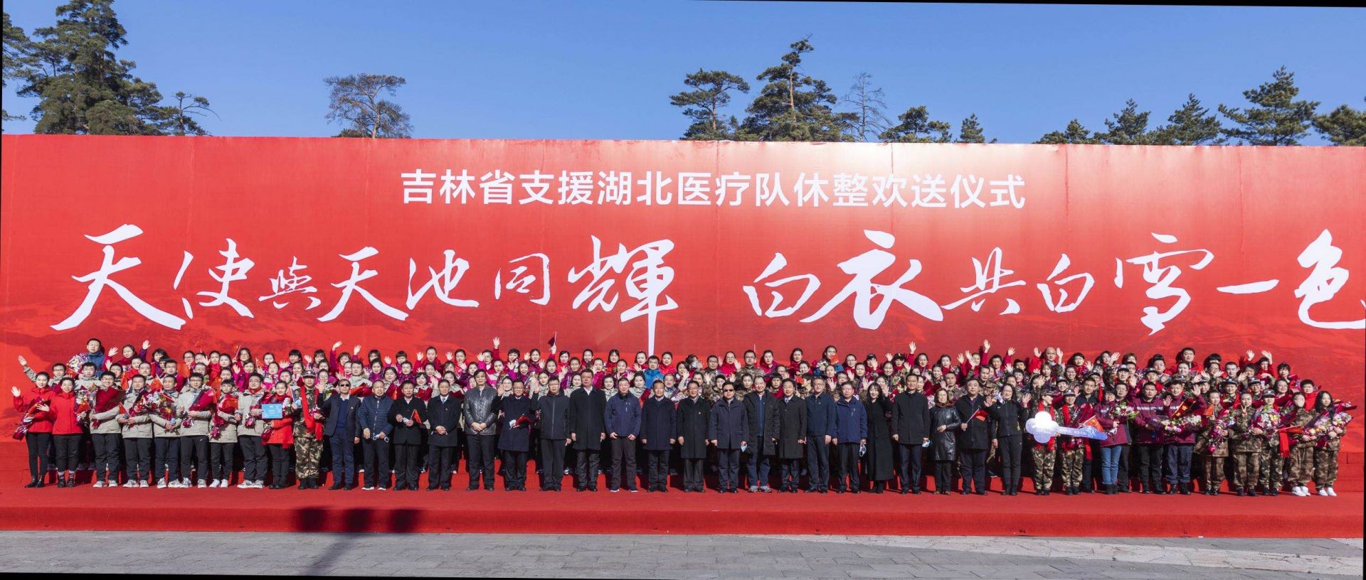 ????張曉慧說,一場疫情使我們集結(jié)在一起,使我們每一名隊員都快速的成長了起來,這就是我們?nèi)松畲蟮氖斋@。我們深深的知道,掌聲和鮮花是對我們的認可和鼓勵,更知道這些是對我們的鞭策。今天我們即將分離,但是我們的任務和責任并沒有結(jié)束,我們會帶著疫情前線的收獲和經(jīng)驗,重返我們各自的崗位,繼續(xù)秉承我們的優(yōu)良作風,繼續(xù)為抗疫工作、繼續(xù)為家鄉(xiāng)的人民作出貢獻?!疤焓古c天池同在,白衣共白雪一色”,我們的隊員與長白山結(jié)下了不解之緣,我們永遠記得長白山秀麗的風景,永遠記得長白山人民和全省人民的深情厚誼。祝愿我們的祖國“疫情阻擊戰(zhàn)”早日取得全面、徹底的勝利。