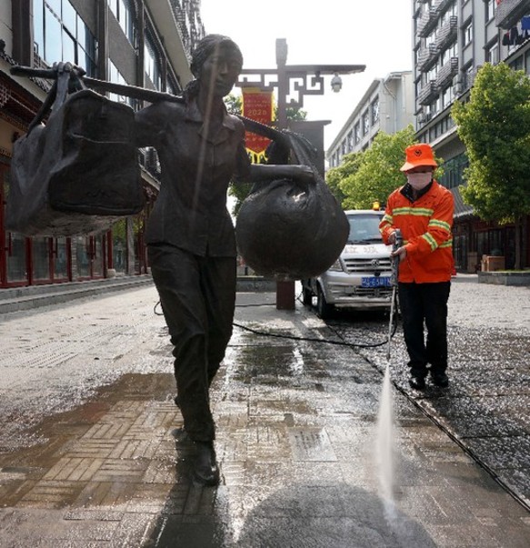 4月6日,環(huán)衛(wèi)工人在武漢漢正街清洗路面。