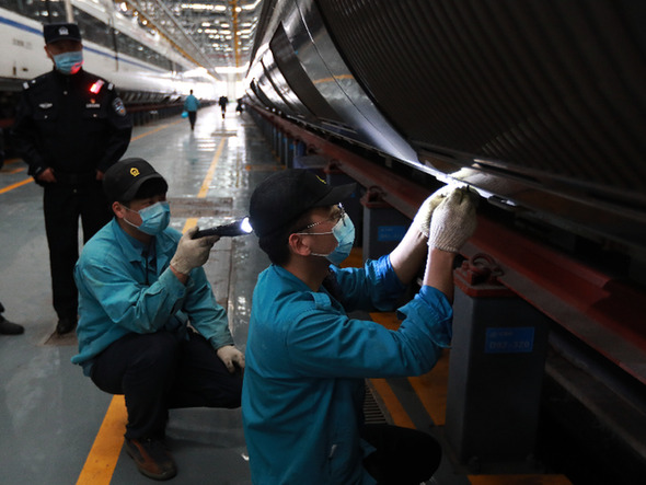 4月6日,武漢動車段兩名維修人員檢查維修高鐵動車組。