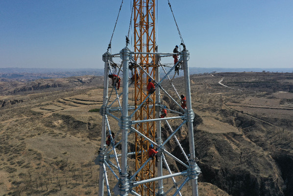 國網(wǎng)工人在蒙西—晉中特高壓交流工程線路工程(內(nèi)蒙古段)12號鐵塔施工現(xiàn)場作業(yè)(無人機(jī)照片)。該工程是華北“兩橫三縱”特高壓交流主網(wǎng)架的重要組成部分。記者 徐欽 攝