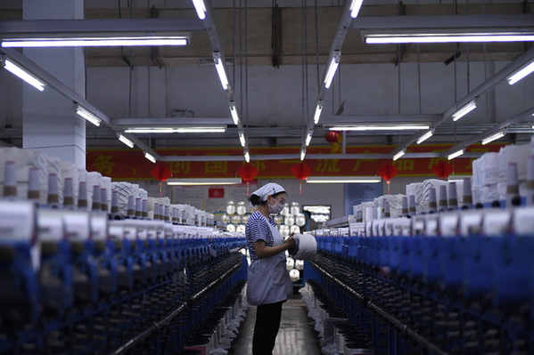 在吉林化纖集團(tuán)股份公司的長(zhǎng)絲車間,工人們正在生產(chǎn)線上工作。(資料照片)
