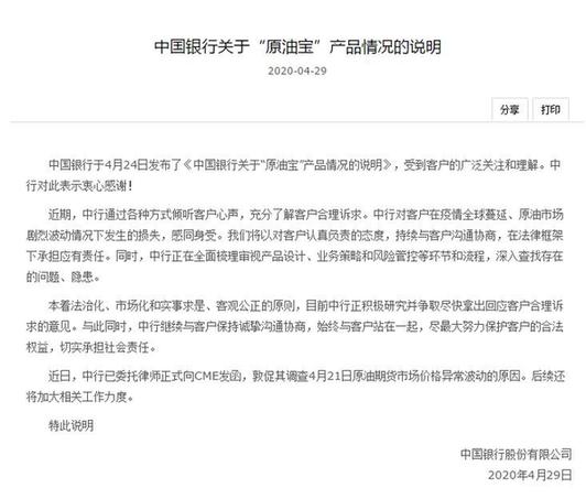 4月24的說明中,中行稱,針對“原油寶”產(chǎn)品掛鉤WTI 5月合約負(fù)結(jié)算價格事宜,中行持續(xù)與市場相關(guān)機構(gòu)溝通,就4月20日市場異常表現(xiàn)進(jìn)行交涉。而在此次最新發(fā)布的29日說明中,中行明確表示,在近日,中行已委托律師正式向CME發(fā)函,敦促其調(diào)查4月21日原油期貨市場價格異常波動的原因。后續(xù)還將加大相關(guān)工作力度。