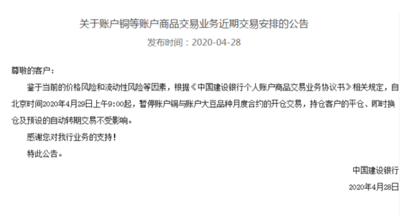 4月28日,中國建設(shè)銀行發(fā)布公告稱,鑒于當(dāng)前的價格風(fēng)險和流動性風(fēng)險等因素,自北京時間2020年4月29日上午9:00起,暫停賬戶銅與賬戶大豆品種月度合約的開倉交易,持倉客戶的平倉、即時換倉及預(yù)設(shè)的自動轉(zhuǎn)期交易不受影響。