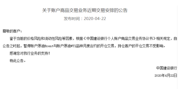 而在此之前的4月22日,中國建設(shè)銀行就已暫停賬戶原油Brent與賬戶原油WTI品種月度合約的開倉交易。并且同步公告稱,有權(quán)調(diào)整賬戶商品交易業(yè)務(wù)WTI2006合約的到期處理時間和處理規(guī)則,對客戶到期未平倉持倉進(jìn)行現(xiàn)金結(jié)算。