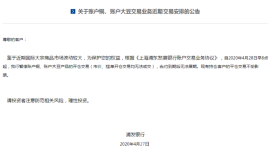 同日,浦發(fā)銀行也發(fā)布公告稱,自2020年4月28日早8點起,該行暫停賬戶銅、賬戶大豆產(chǎn)品的開倉交易(市價、掛單開倉交易均無法成交),合約到期后無法展期?,F(xiàn)有持倉客戶的平倉交易不受影響。?此前浦發(fā)銀行于4月23日發(fā)布公告自4月24日起暫停賬戶原油產(chǎn)品的開倉交易。