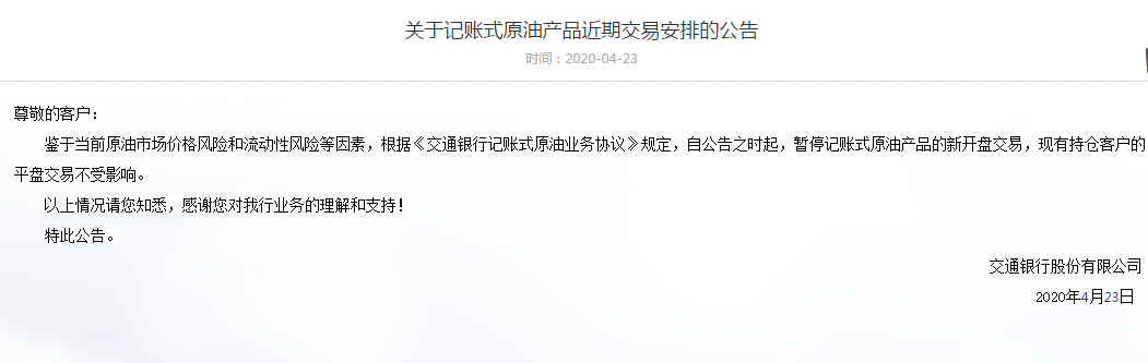 4月23日,交通銀行也暫停了記賬式原油產(chǎn)品的新開盤交易。