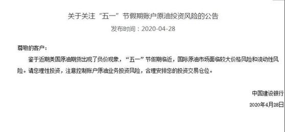 4月28日,中國建設(shè)銀行發(fā)布公告稱:鑒于近期美國原油期貨出現(xiàn)了負(fù)價現(xiàn)象,“五一”節(jié)假期臨近,國際原油市場面臨較大價格風(fēng)險和流動性風(fēng)險。請您理性投資,注意控制賬戶原油業(yè)務(wù)投資風(fēng)險,合理安排您的投資交易倉位。